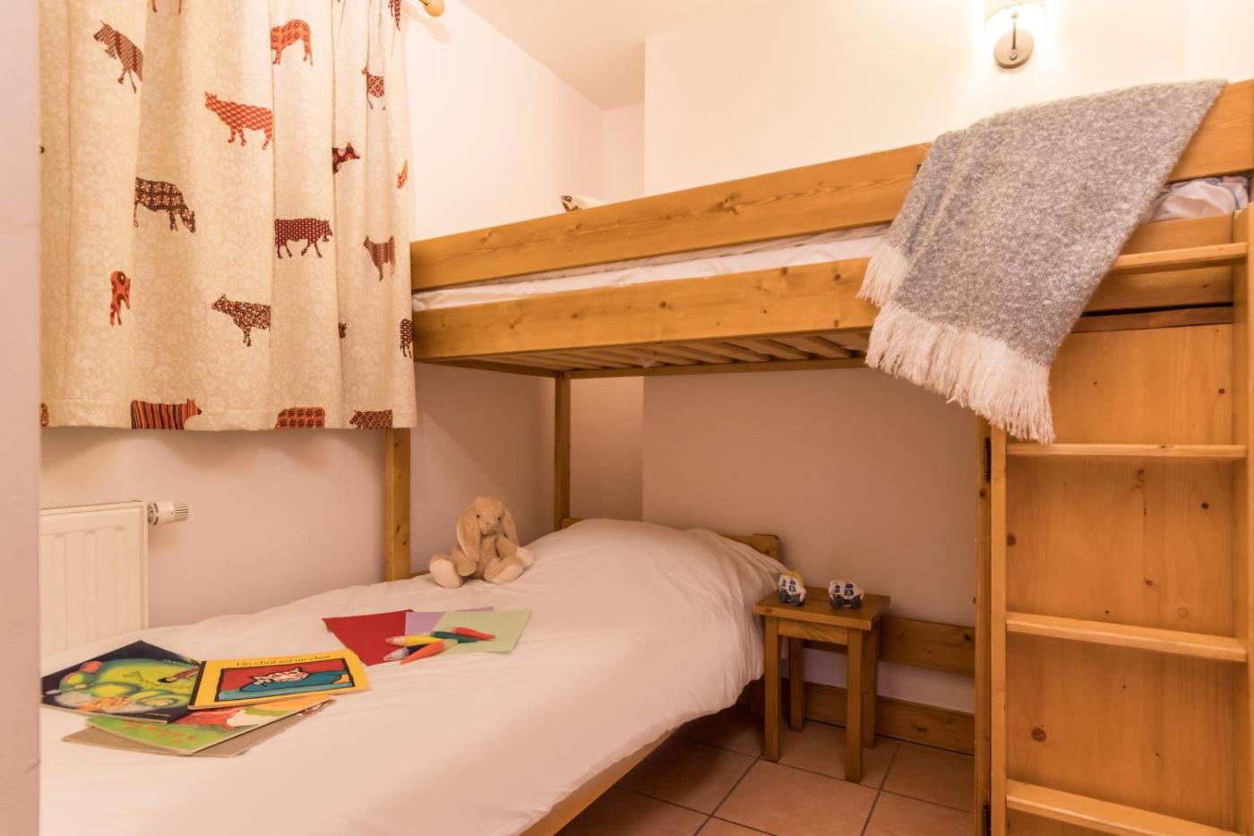 Appartement 1 Chambre avec Coin Nuit en Alcôve et Balcon (5 Personnes). Cet appartement comprend une pièce à vivre avec un canapé-lit double et une alcôve avec des lits superposés (recommandés pour les enfants). Cet hébergement comporte une chambre avec un lit double. Les lits sont faits avant votre arrivée. La salle de bains indépendante est pourvue d’une baignoire. La kitchenette entièrement équipée s’ouvre sur la pièce à vivre. Veuillez noter que vous devrez nettoyer le coin cuisine avant votre départ. ;