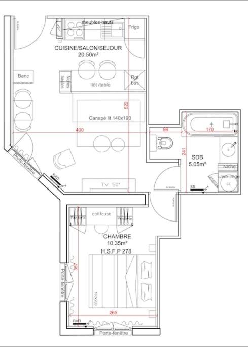 Appartement 1 Chambre. This apartment includes 1 living room, 1 separate bedroom and 1 bathroom with a bath and free toiletries. Guests can make meals in the kitchen that is fitted with a stovetop, a refrigerator, kitchenware and a microwave. The apartment offers a washing machine, a tea and coffee maker, a dining area, a wardrobe and a flat-screen TV. The unit has 2 beds.