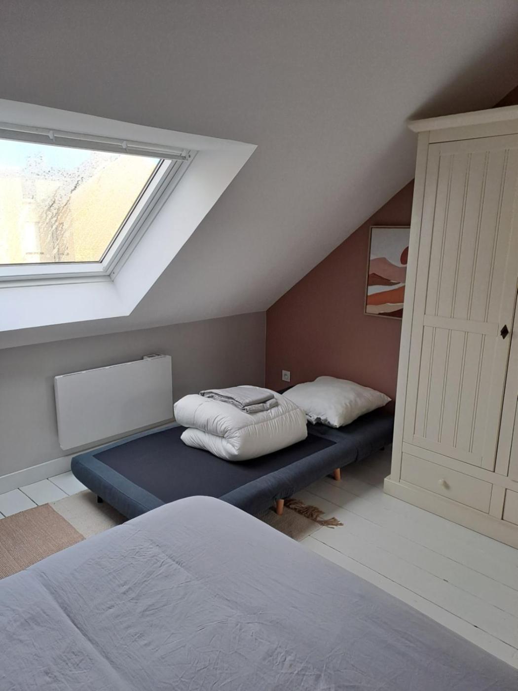 Appartement en Duplex. Featuring a private entrance, this spacious apartment also is comprised of 1 living room, 2 separate bedrooms and 1 bathroom with a shower. Guests can make meals in the kitchen that is fitted with a stovetop, a refrigerator, a dishwasher and kitchenware. The apartment features parquet floors, a seating area with a flat-screen TV, a washing machine, a tea and coffee maker as well as city views. The unit offers 3 beds.