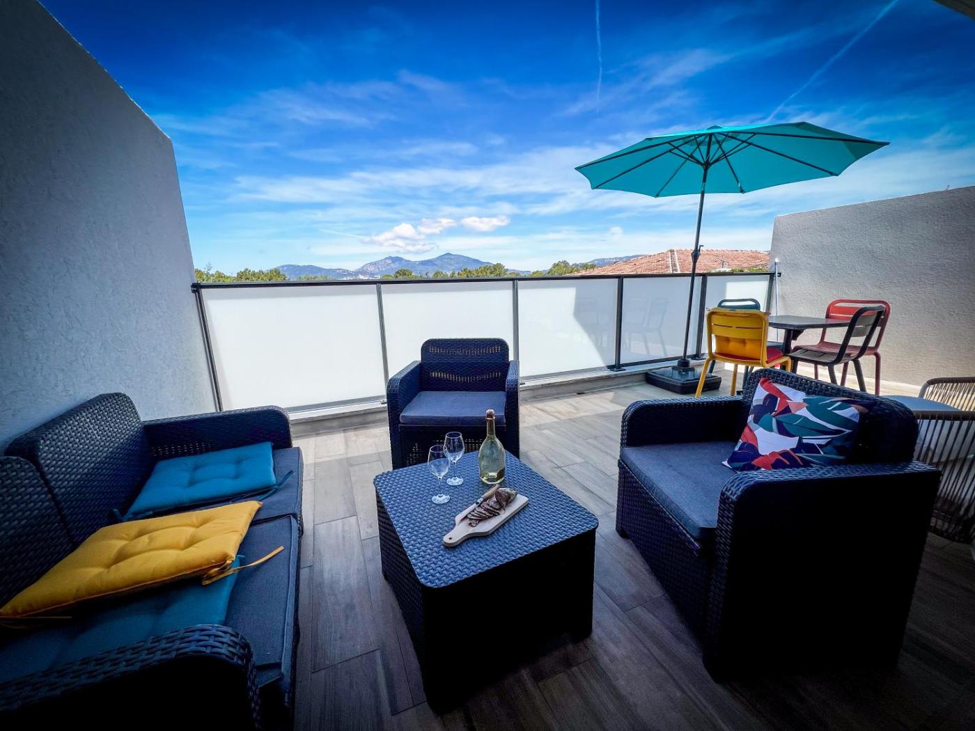 Appartement 1 Chambre avec Vue. Guests will have a special experience as this apartment offers a hot tub. This air-conditioned apartment is comprised of 1 living room, 1 separate bedroom and 1 bathroom with a shower. The well-equipped kitchen has a stovetop, a refrigerator, kitchenware and an oven. This apartment features a washing machine, soundproof walls, a flat-screen TV and a terrace. The unit offers 2 beds.