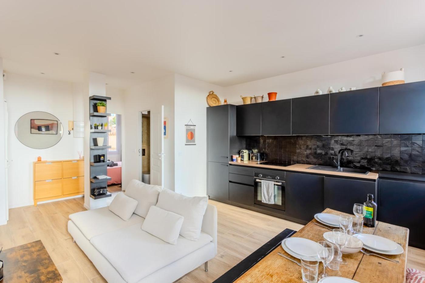 Appartement 1 Chambre. Featuring a private entrance, this apartment also comprises 1 bedroom, a seating area and 1 bathroom with a walk-in shower and a hairdryer. In the well-fitted kitchen, guests will find a stovetop, a refrigerator, a dishwasher and an oven. The apartment provides a washing machine, soundproof walls, a coffee machine, a flat-screen TV with satellite channels, as well as sea views. The unit offers 1 bed.