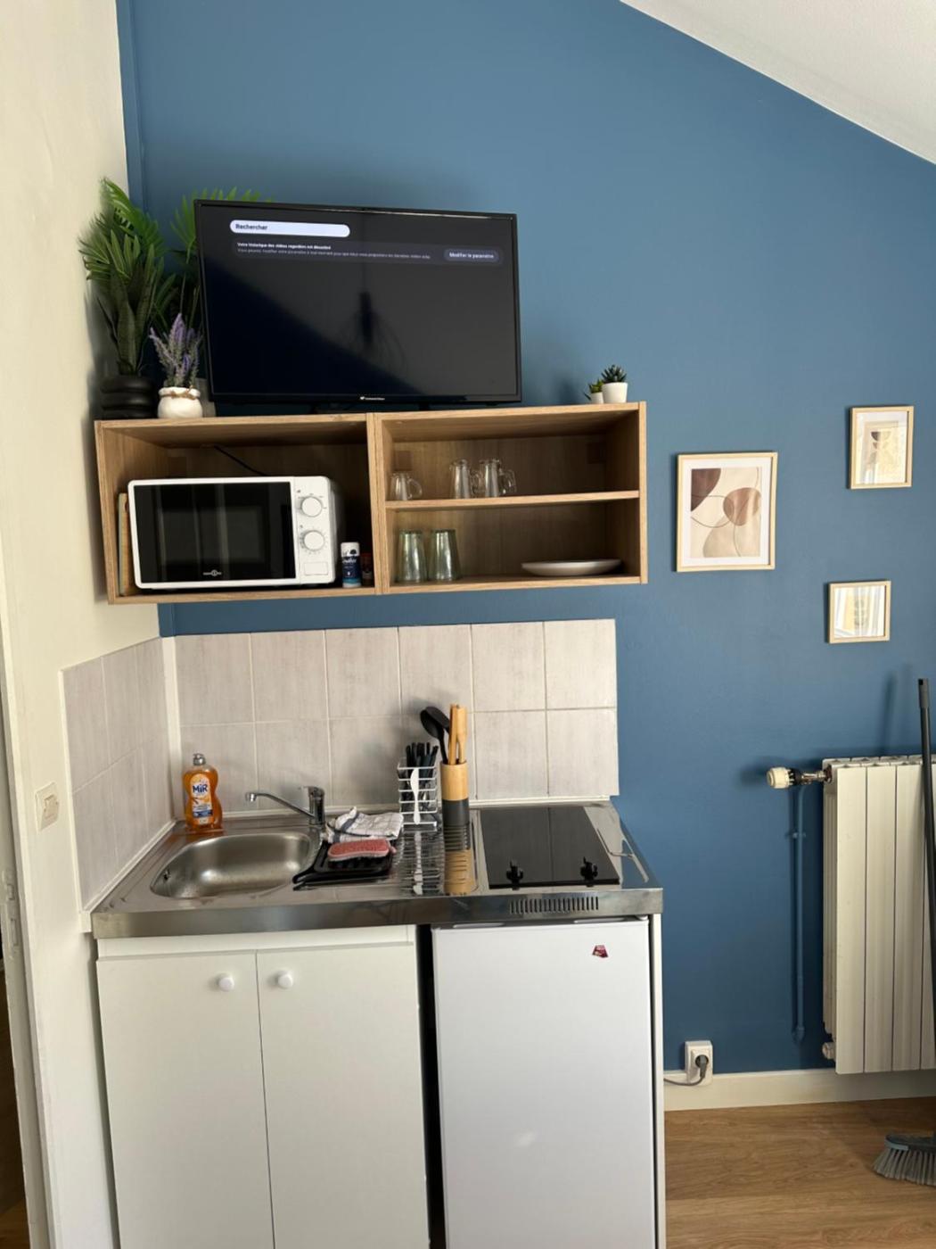 Cet appartement comporte 1 chambre, une télévision à écran plat, ainsi qu’une kitchenette.