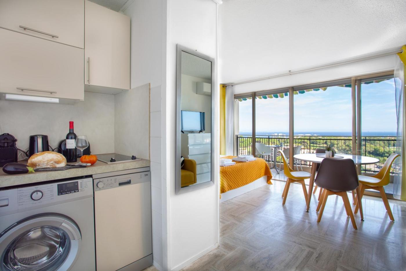 Appartement 1 Chambre. This apartments standout feature is the pool with a view. This apartment includes 1 living room, 1 separate bedroom and 1 bathroom with a shower and free toiletries. In the fully equipped kitchen, guests will find a stovetop, a refrigerator, a dishwasher and kitchenware. The air-conditioned apartment offers a flat-screen TV, a washing machine, soundproof walls, a tea and coffee maker as well as sea views. The unit has 2 beds.