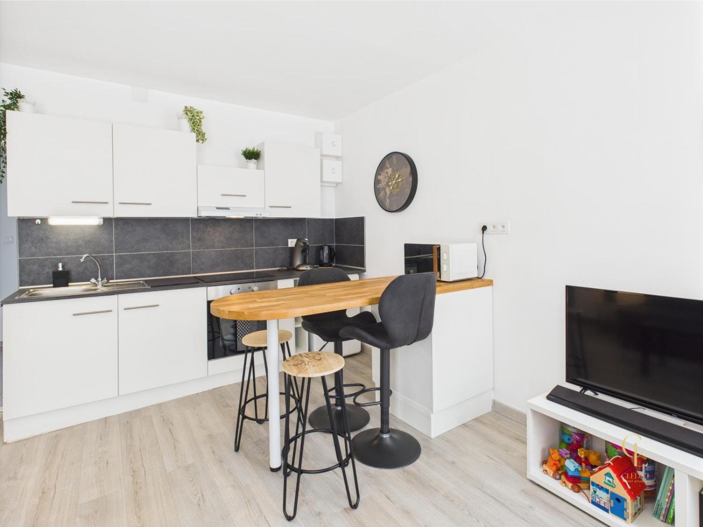 Cet appartement se compose de 2 chambres, dun salon, dune cuisine entièrement équipée avec un réfrigérateur et une machine à café, ainsi que de 1 salle de bains avec une douche et un sèche-cheveux.