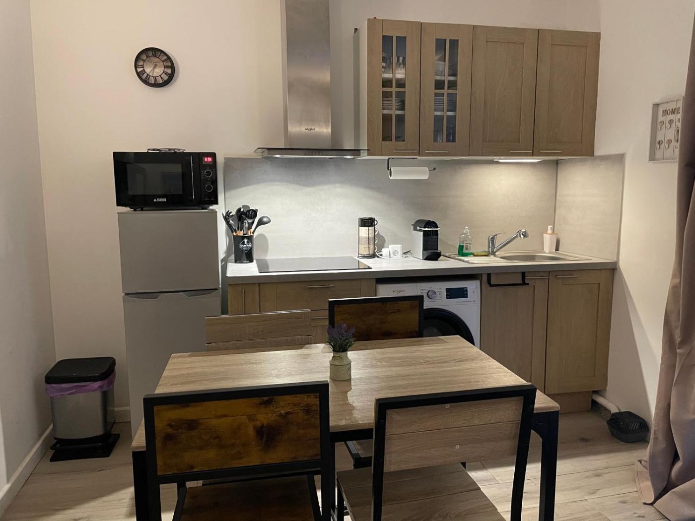 Appartement 1 Chambre. Featuring a private entrance, this air-conditioned apartment is comprised of 1 living room, 1 separate bedroom and 1 bathroom with a shower and a hairdryer. In the fully equipped kitchen, guests will find a stovetop, a refrigerator, kitchenware and a microwave. The apartment features tiled floors, a seating area with a flat-screen TV, a washing machine, a coffee machine as well as a quiet street view. The unit offers 2 beds.