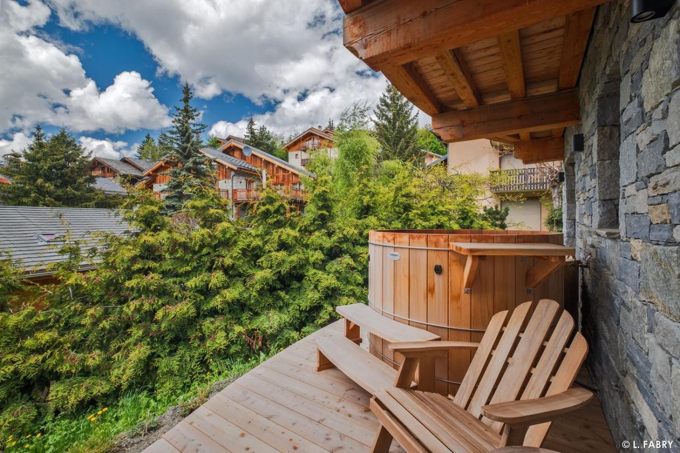 Chalet. Guests will have a special experience as this chalet offers a hot tub, a sauna and a fireplace. This spacious chalet consists of 1 living room, 4 separate bedrooms and 4 bathrooms with a shower. The well-fitted kitchen features a stovetop, a refrigerator, a dishwasher and kitchenware. Featuring a terrace with mountain views, this chalet also provides a washing machine and a flat-screen TV. The unit offers 4 beds.