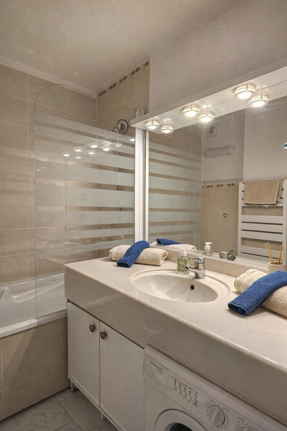 Appartement 2 Chambres. This apartment features a private pool. This apartment features 1 living room, 1 separate bedroom and 1 bathroom with a bath and a hairdryer. Guests can make meals in the kitchen that has a stovetop, a refrigerator, a dishwasher and kitchenware. The apartment features a washing machine, a coffee machine, a dining area, a flat-screen TV, as well as sea views. The unit has 4 beds.